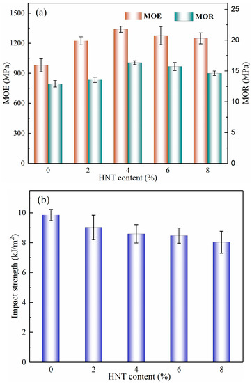 The effects of the HNT content on the flexural properties of BPCs are illustrated in Figure 1a. The modulus of rupture (MOR) and modulus of elasticity (MOE) of the BPCs were increased gradually as the HNT loading increased up to 4 wt%. Composites made with 4 wt% HNTs showed maximum strength and flexural modulus values that were increased by about 36.73% and 26.55%, respectively, compared with neat BPCs. However, the flexural properties of the BPCs moderately decreased as the HNT content increased from 6 wt% to 8 wt%. It is assumed that the decrease in mechanical properties was due to the agglomeration of nanoparticles as higher proportions of HNTs were loaded in the composites, as further supported by the SEM analysis.