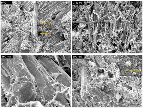 The morphological features of the fracture surfaces of BPCs were investigated with SEM (Figure 2). From the micrograph of BPC, it can be observed that bamboo fibers were pulled out of the matrix and micro holes appeared, suggesting a poor interfacial bonding between the BFs and LDPE matrix. Openings between the plastic and bamboo fibers were clearly visible, and could lead to higher water absorption and reduced mechanical properties. BPC-4% samples showed a fuzzy rupture interface with filamentous resin, and the fibers were surrounded by the polyethylene resin with well-dispersed HNTs. These nanotubes can form a “skeleton” in the polymers to increase the bonding at the fiber–matrix interface, enhancing the composite strength [32]. Wang et al. [14] also reported that inorganic nanoparticle impregnation treatments could improve the compatibility between bamboo fibers and polymer matrix, resulting in increased mechanical properties of the composites. As can be clearly seen from the fracture morphology of the BPC-6% sample, increasing the HNT loading to 6 wt% resulted in aggregation in the BPC matrix. The existence of HNT agglomerates is believed to reduce the mechanical properties of the composites. Tabari et al. [33] also found that there was no chemical interaction between the mineral nanofillers and other components in WPCs, and the aggregation of the fillers reduced the adherence of the matrix with the bamboo fiber.