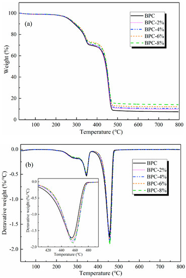 From the differential thermogravimetric (DTG) curves (Figure 4b), it was found that the addition of HNTs slightly shifted the peak degradation temperatures of the BPCs towards higher temperatures. The temperature of the maximum mass loss rate was found at 459.67 °C for BPC-4%, which was higher than that of the control sample (451.56 °C). Based on all the results above, it is believed that the thermal resistance of HNTs themselves is responsible for the improved thermal stability of BPCs. In fact, the hollow structure of HNTs is expected to entrap decomposition products, which could play a positive role in forming of a char layer and delaying the mass transfer [24]. Additionally, the improvement in thermal stability is also attributable to the released water from the degradation of interlayer aluminum oxide in HNTs and the metal oxides in contamination of HNTs efficiently trapping free radicals during the degradation reaction [38].