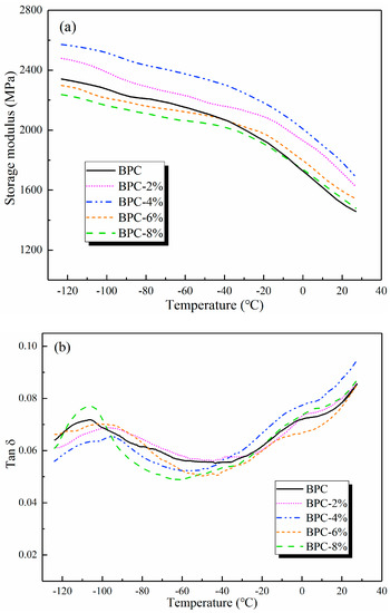 Plots of (a) storage modulus and (b) tan δ of the BPCs.