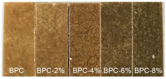 The BFs and LDPE, with a weight ratio of 40%:60% (w/w), were premixed for 60 min at 50 °C in a malaxator (NH-1, Guancheng Machine Company, Jiangsu, China). The HNT nanoparticles were added slowly to the mixtures at concentrations of 2 wt%, 4 wt%, 6 wt%, and 8 wt% (based on the total matrix) while the mixing process occurred. Before hot pressing, the mixtures were weighed accurately to ensure the target density of the BPCs was 1.0 kg/m3. The mixtures were subsequently placed in a mold with the dimensions 250 mm × 90 mm × 3.5 mm and hot-pressed at 150 °C for 30 min at a pressure of 6 MPa (3895, Carver Co., Ltd., Wabash, IN, USA). Finally, the composites were removed when the temperature decreased below 35 °C. Control samples without any fillers were also prepared. The BPCs with 2 wt%, 4 wt%, 6 wt%, and 8 wt% HNTs were denominated BPC-2%, BPC-4%, BPC-6%, and BPC-8%, respectively. The final BPCs are shown in Figure 6.