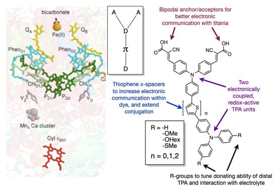 Building on this initial report, we now present a more extensive family of bio-inspired dyes (Figure 1). While the comparison between biology and the DSSC has been made before [], our dye design attempts to mimic the dimeric structure of photosystem II (PSII). In PSII, two quinoidal routes exist (akin to the bipodal acceptor motif) that can extract charge from the reaction centre. The reaction centre (P680) is comprised of two cofacial porphyrin rings that create an electronically-coupled redox-active environment (akin to two TPA donors). In this study, we now delve deeper into the structure–property relationships involving the nature of the π-spacer between the TPA units and the electronic tuning of the distal (from anchors) TPA. In our previous study, it was unclear if the enhancement in dye performance was due to redox interplay of the two donors, or increased conjugation and hydrodynamic volume of the dye. To this end, we present a modified dye topology with a D-π-D-A motif that has greater control on the redox potential of the distal TPA unit, while contrasting the electronic separation of the donors.