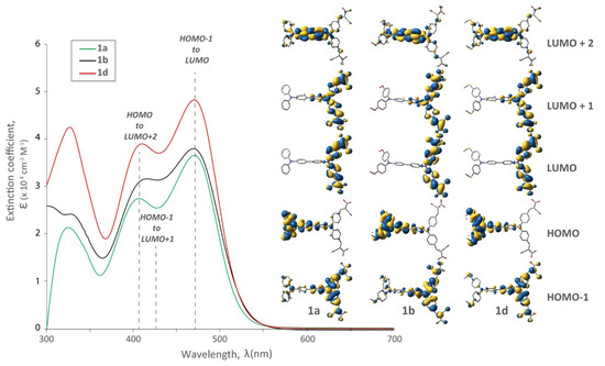 In order to better appreciate the optical behaviour imparted by our structural variations, TD-DFT calculations were performed and their insight is included in Figure 3, Figure 4 and Figure 5. In each of the dyes studied, HOMO-LUMO optical transitions are not observed because of insufficient wavefunction overlap between these orbitals and a resulting weak transition oscillator strength. Considering the substitution on the distal TPA (Figure 3), there is a minimal effect on the visible portion of the absorption profile. Although there were more significant differences at shorter wavelengths (~325 nm), bathochromic shifts at longer wavelengths were not observed by the introduction of different R substituents. While perhaps a little disappointing, this optical parity is actually quite significant, because it allows us to focus on the electronic effects these substituents impart on the dye (and device performance). A subtle change was observed in the visible region (400–500 nm) as the two maxima in 1b appear less resolved. This is rationalized due to the decreased oscillator strength for the HOMO to LUMO + 2 transition and an increase in the HOMO − 1 to LUMO + 1 contribution. It is worth noting that in all cases the electron density in the HOMO level was at the distal TPA, and the LUMO and LUMO + 1 on the proximal TPA. In the LUMO + 2 the electron density was shared between the two TPAs. The electron density in the HOMO − 1 was also concentrated on the proximal TPA with some delocalization throughout the molecule.
