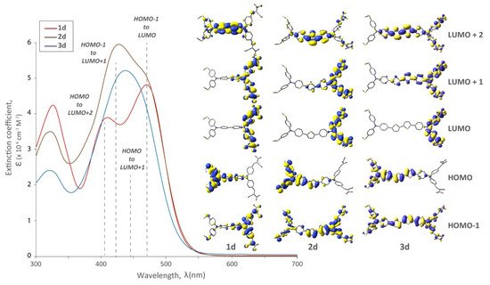 UV-Vis spectra and relevant molecular orbitals of bichromic/bipodal dyes (1d, 2d, 3d). The effect of extending the π-spacer on the distal TPA while holding the distal substitution constant with -SMe. This distal modification was chosen judiciously because these dyes produced the highest performing DSSCs (vide infra).
