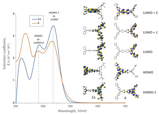 UV-Vis spectra of dye 1a vs. 4 (3-thienyl substituents on distal TPA unit), and their respective DFT frontier orbitals.