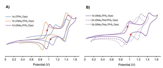 Examining substituent (A) and π-spacer effects (B) with cyclic voltammetry (DCM, 100 mV/s, 0.1 M NBu4PF6). A) In 1b the strong donating effects of -OMe destabilize the HOMO of the distal TPA compared to 1a or 1d, while only modestly affecting the second oxidation potential. B) Contrasts the inclusion of additional π-spacers 1d (none), 2d (one), 3d (two). While only modest changes are observed in the distal TPA oxidation potential, the inclusion of additional thiophene π-spacers more dramatically decreases the second oxidation potential.