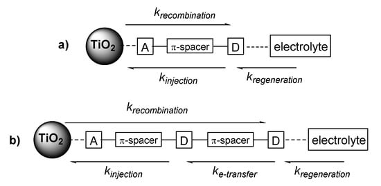 - Hu, K.; Robson, K.C.D.; Beauvilliers, E.E.; Schott, E.; Zarate, X.; Arratia-Perez, R.; Berlinguette, C.P.; Meyer, G.J. Intramolecular and Lateral Intermolecular Hole Transfer at the Sensitized TiO2 Interface. J. Am. Chem. Soc. 2014, 136, 1034–1046. [Google Scholar] [CrossRef] [PubMed]