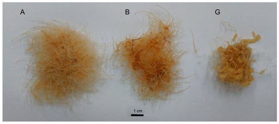 Morphology of A, B and G clones of hairy root cultures of P. quinquefolium after 28-days cultivation.