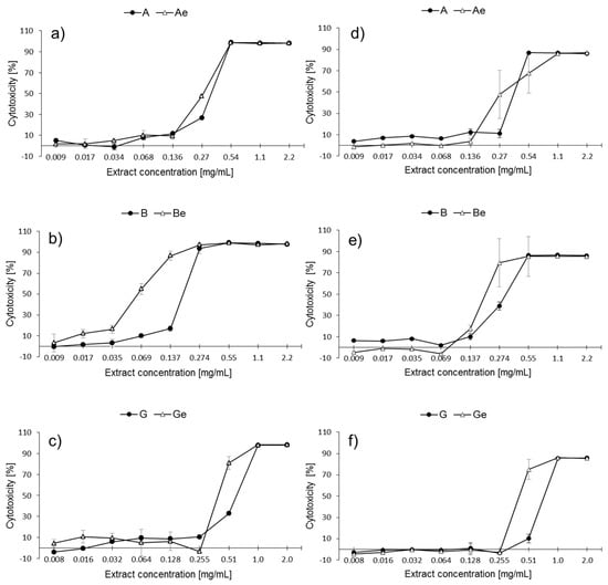 In the PB assay, for extracts A and Ae, a relevant increase in the cytotoxic activity (from 11.2% ± 3.9% to 86.9% ± 0.3%) was observed between concentrations 0.27 and 0.532 mg/mL. The strongest increase in cytotoxicity was observed between the concentrations of 0.27 and 0.54 mg/mL (Figure 2d). Similar tendencies were observed for extract B and extract Be: the strongest cytotoxicity was observed for the highest concentrations (up to approximately 86%). For extracts G and Ge (Figure 2f), a rapid decrease in the metabolic activity (from 10.3% ± 4.0% to 85.8% ± 0.1% for extract G) was observed, starting from the concentration of 0.51 mg/mL. In the case of Ge, a strong increase of cytotoxicity up to 75.1% ± 9.3% was observed, starting from the concentration 0.255 mg/mL. The highest concentrations of both extracts were the strongest inhibitors of the metabolic cellular activity (up to approximately 86%). Furthermore, extract G demonstrated the lowest cytotoxic activity among all the studied extracts. Generally, the P. quinquefolium extracts derived from the plant cultures that underwent elicitation displayed a stronger influence on cellular viability than those that did not.