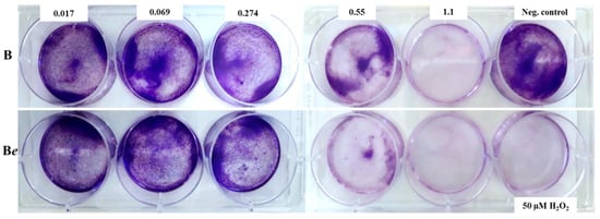 As extracts B and Be appeared to display the strongest cytotoxic and anti-proliferative effects, they were thus taken for further analysis according to Choi et al., 2018 [], with some modifications. To each well of a 6-well plate, 3.5 × 105 cells were seeded and cultured to reach 80% confluence. After that, cells were washed with PBS and exposed to extracts of concentrations from 0.017 to 1.1 mg/mL for 60 min. The positive control was 50 µM H2O2. After that, all cells in each well were harvested, and counted according to the standard procedures. Next, 1000 cells were inoculated on each well of the 6-well plate and cultured for 7 days to enable the formation of the colonies. The colonies were fixed with 3.7% paraformaldehyde for 15 min, air-dried and stained with 0.1% crystal violet.