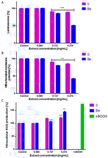 The effects of the 48-h P. quinquefolium B (non-elicited) and Be (elicited) extract treatment on the ATP level of Caco-2 cells as determined by the ATP luminescent assay kit (A); mitochondrial membrane potential was determined with a JC-1 probe (B); intracellular reactive oxygen species (ROS) generation was analyzed by a DCFH-DA assay (C), as a positive control of 50 µM t-BOOH was used; control cells were not exposed to any compound but the vehicle (medium). Values are presented as the mean (n ≥ 8) ± SD; statistical significance was calculated versus the control cells (untreated), *** p < 0.001.