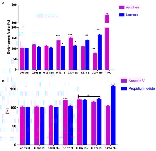 The effects of the P. quinquefolium B (non-elicited) and Be (elicited) extracts after 48 h treatment of Caco-2 cells: phosphatidylserine externalisation on the outer membrane leaflet of the apoptotic cells and membrane permeabilization were detected with the annexin-V-FITC assay kit and propidium iodide staining (A); the late stage of apoptosis was analyzed by a cell death detection kit (B), PC—internal positive control of the assay. Control cells were not exposed to any compound but the vehicle (medium). Values are presented as the mean (n ≥ 8) ± SD; statistical significance was calculated versus the control cells (untreated), * p < 0.05, ** p < 0.01, *** p < 0.001.