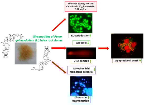 Here, we also demonstrated the biological activities of the extracts obtained from the P. quinquefolium roots (Figure 9). As intestinal cells are mostly influenced by large quantities of dietary and plant-originated compounds, the human epithelial adenocarcinoma Caco-2 cell line was chosen as a cellular model. The main aim of our study was to determine the potential for ginsenosides to induce death in cancer cells, i.e., immortalised Caco-2 cells. Importantly, an apoptosis induction was detected at relatively high dosages. Our findings suggest that extracts derived from the elicited P. quinquefolium roots exerted a higher biological activity towards Caco-2 cells than the non-elicited extracts. The elicitation process was associated with significant increases in the Rb group saponins levels in the root cultures. Among the six studied clones of the P. quinquefolium hairy root extracts, the strongest inhibitors of the cellular metabolic activity, and apoptosis inducers, were extracts B and Be (elicited). Due to the observed depletion of the mitochondrial membrane potential and ATP level, we suspect that the main inducer of apoptosis was the ROS generation. In this case, extracts with high quantities of ginseng demonstrated a prooxidative activity against cells, probably leading to lipid and protein peroxidation, as well as DNA damage.