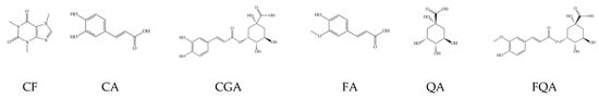 Chemical structures of caffeine (CF), caffeic acid (CA), chlorogenic acid (CGA), ferulic acid (FA), quinic acid (QA), and feruloylquinic acid (FQA) present in coffee [].
