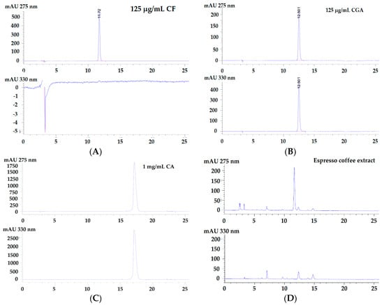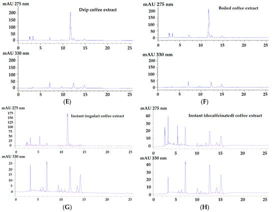 HPLC/DAD profiles of authentic standards including caffeic acid (CA), caffeine (CF), and chlorogenic acid (CGA); espresso, drip, boiled and instant coffee extracts (A–H).