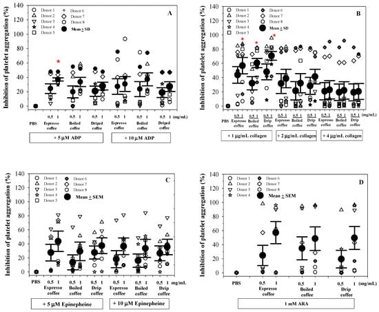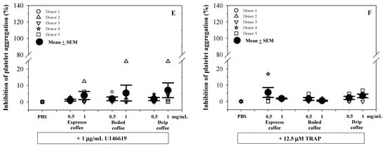 Inhibitory effects of phosphate-buffered saline (PBS) and coffee extracts (0.5 and 1 mg/mL each) on aggregation of platelets induced by adenosine diphosphate (ADP) (A), collagen (B), epinephrine (C), sodium arachidonate (ARA) (D), U46619 (E) and thrombin receptor agonist peptide (TRAP) (F). Data obtained from different blood samples are expressed as mean ± SEM values. * p < 0.05 when compared without the coffee extract treatments (PBS).