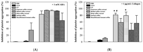 Inhibitory effects of phosphate-buffered saline (PBS), coffee extracts (0.5 and 1 mg/mL each), 18.23 mg/mL chlorogenic acid (CGA) and 54.17 mg/mL caffeine (CF) on aggregation of platelets induced by collagen (B) and sodium arachidonate (ARA) (A). Data obtained from five blood samples are expressed as mean + SEM values. * p < 0.05 when compared with the CGA; # p < 0.05 when compared to the CF.