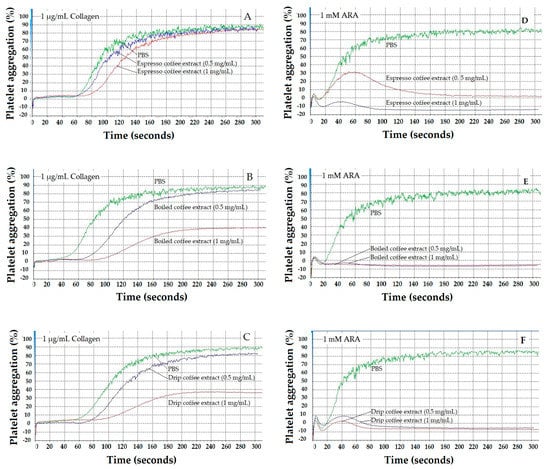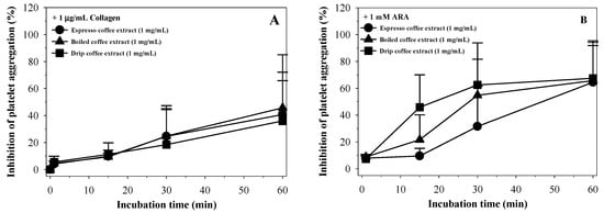Moreover, the inhibitory effects on the agonists-induced platelet aggregation seemed to be dependent upon the incubation time of the coffee extracts. Consequently, the inhibition potency was found to be in the order of drip coffee > boiled coffee > espresso coffee with regard to ARA stimulation, whereas it was not observed to be different with regard to collagen stimulation (Figure 6A–B).