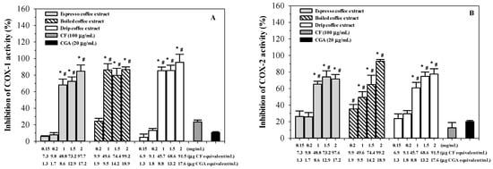 Inhibition of cyclooxygenase 1 (COX-1) and cyclooxygenase 2 (COX-2) activities by indomethacin (100 mg/mL), caffeine (CF, 100 μg/mL), chlorogenic acid (CGA, 20 μg/mL), espresso coffee, boiled coffee, and drip coffee extracts (2 mg/mL each). Data obtained from five separate duplicate measurements are expressed as mean ± SEM values. * p < 0.05 when compared with the CGA; # p < 0.05 when compared to the CF.