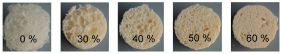 In a following experiment the release of cytotoxic components was tested from pre-eluted foams with varying CaCO3 concentrations from 0% to 60% (w/w). These foamed specimens were stored for 72 h in water at 37 °C with a daily change of the water. After drying, the samples were eluted for 24 h with medium as described for the WST-1® assay. The results are shown in Figure 7b. The release of toxic components from specimens with CaCO3 was much smaller compared to the first eluate of the unleached specimens shown in Figure 7a, indicated by relative dehydrogenase activities of about 90% of the negative control. Only the foam specimen without CaCO3 again showed cytotoxicity.