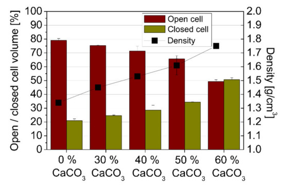 Density and open/closed cell volume of fCM samples with different amounts of calcium carbonate (type SP01).