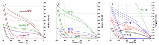 At first the compressive strength was measured as a function of the CaCO3 particle size Figure 3a. A CaCO3 content of 60% (w/w) and 80 µL/g DMSO as softener were used. It was found that the compressive strength of the composite foams decreased with increasing particle size of the CaCO3 filler. Thus, with the CaCO3 particle size of 5 µm (SP01, brown curve) the highest compressive strengths of about 0.89 MPa were found, whereas specimens with a particle size of 12 µm (type 47, green curve) had compressive strengths of 0.39 MPa followed by the lowest values of 0.31 MPa for CaCO3 particle size of type 02 (diameter: 22 µm, purple curve). Next, the compressive strength was investigated varying the content of CaCO3 (SP01) in the fCM from 30% up to 60% maintaining a constant content of 80 µL/g DMSO as softener. As shown in Figure 3b, the compressive strength increased with increasing CaCO3 content in the composites from 0.12 to about 0.89 MPa. Furthermore, the compressive strength was influenced by the content of DMSO accelerating the foaming rate and acting as a softener. Figure 3c shows that the compressing strength was substantially decreasing with increasing DMSO amounts. Without adding DMSO the compression strength reached 19.9 MPa but decreased to 0.89 MPa at a DMSO content of 80 µL/g.