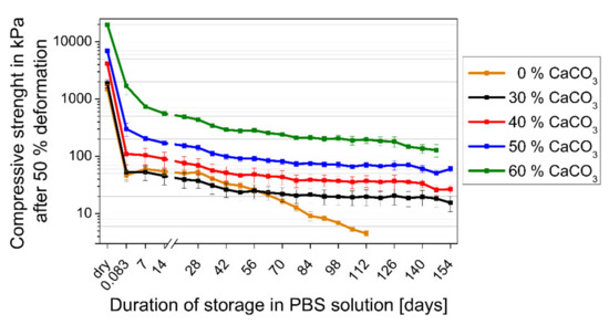The compressive strength of fCM specimens containing 60% CaCO3 (SP01, w/w) was initially measured in a dry state and then after storage in PBS medium at 37 °C at intervals of 7 days (Figure 4). It has been observed that the compressive strength decreased after contact with liquid medium from about 19.8 MPa in the dry state to about 1.7 MPa after 2 h of storage in PBS. The higher the CaCO3 content in the composites, the higher was the compressive strength. This trend extended over the entire period of storage in PBS. After 119 days, specimens without CaCO3 started to dissolve and were discarded. After 154 days, samples with CaCO3 started to decompose.