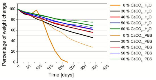 In case of implantation, a rapid decrease in the compressive strength of the fCM in a moist tissue environment may have a negative effect on the mechanical implant stability. When stored in PBS, the investigated fCM show a rapid decline in mechanical stability, which, however, can be remarkably improved by increasing the CaCO3 content in composite material (Figure 2). This is also supported by the finding that under in vitro conditions the unfilled polymer material is already completely degraded after approx. 119 days, whereas the fCM with added CaCO3 only begins to degrade after 154 days. In vitro degradation experiments of polymeric samples without CaCO3 performed both in water and PBS medium exhibited a faster decomposition in water due to the low pH-value of the storage solution, which accelerate the degradation catalytically.