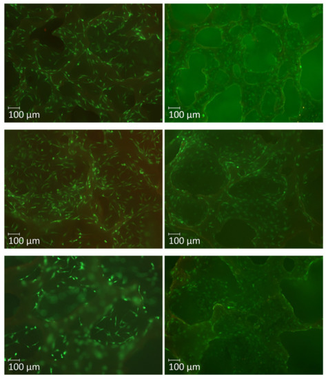 Live/dead staining experiments have been performed with composite foams containing 60% (w/w) of each CaCO3 sample batches 47, 02, and SP01. After an incubation period of 1 and 3 days respectively, a large number of viable and only a few dead cells (less than 5%) were found on the composite surfaces. In Figure 6 results of live/dead staining experiments for composite foams containing 60% of different CaCO3 sample batches are exemplarily shown.
