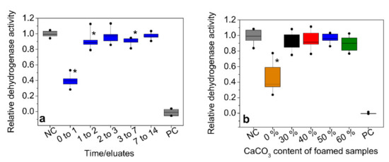 As shown from Figure 7a, during the first 24 h of elution of the specimens in medium, strong cytotoxicity was observed indicated by a decrease of cellular dehydrogenase activity to about 40% compared to the negative control. Then, until day 14 the relative dehydrogenase activity of MC3T3-E1 cells was in the range between 90 and 100% of the negative control implying a cytocompatible behaviour of the eluates. For the third eluate (day 2–3) and the fifth eluate (day 7–14) the test on the significance of the distance to the negative control even failed substantiating a missing or a very low level of cytotoxicity. The cytotoxicity during the first 24 h is probably caused by the release of DABCO, which was added as foaming catalyst.