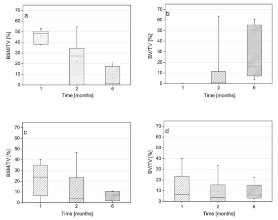 Results of remaining bone substitute material after vertical augmentation of (a) the calvaria and (c) the mandible. Boxplots show remaining bone substitute material in the area (bone substitute material volume/tissue volume; BSM/TV). Results of newly formed bone after vertical augmentation of (b) the calvaria and (d) the mandible. Boxplots show the newly formed bone in the total area (bone volume/tissue volume; BV/TV).