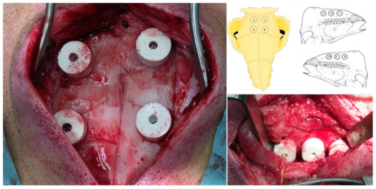 The periosteum and the skin were then sutured in several layers (Vicryl® 3.0; Vicryl® 1.0; Ethicon, Norderstedt, Germany). Subsequently, the animals were turned on their backs under padding of the operated skull and local anaesthetic was applied on both sides in the area of the lower jaw margin. Now an incision was made in the area of the lower jaw margin on both sides, protecting the facial artery. After a subperiosteal preparation and ablation of the cortical bone analogous to the skull, each three specimens were screwed onto the mandible (Figure 2, at the bottom right of the picture a photo of the intraoperative situation, schematic drawing on the right side of the upper right picture), resulting in a total of 10 specimens for each animal. The periosteum and the skin were then sutured in several layers (Vicryl® 3.0; Vicryl® 1.0).