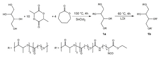 The prepolymer was synthesized in a two-step procedure [30]. After preparing the PLA-co-PCL oligoester 1a by ring-opening-polymerization of l-lactide and ε-caprolactone in the presence of meso-erythritol as initiator, the latter was treated with LDI to introduce isocyanate groups onto the terminal hydroxyl groups of the oligolactone giving the isocyanate terminated prepolymer ITP 1b. The syntheses are depicted in Scheme 1 and the characteristics of the prepolymers 1a and 1b are found in Table 1.
