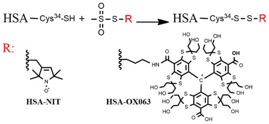 Spin labelling of HSA. Reaction of the methanethiosulfonate group of the spin label reagent with the thiol group of Cys-34 to generate spin-labelled HSA, R: nitroxide or OX063 labels.