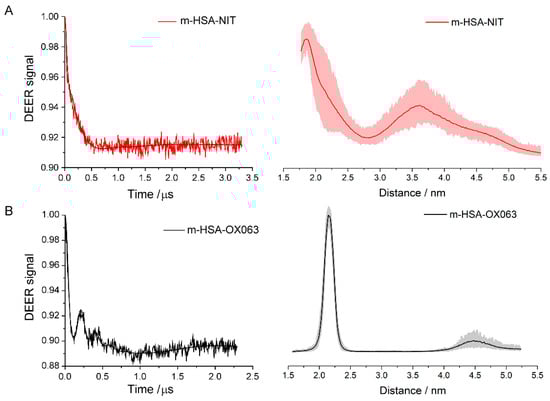 Q-band DEER results for (A) m-HSA-NIT sample; (B) m-HSA-OX063 sample. Background-corrected DEER time traces are on the left, distance distributions on the right. Shaded areas show uncertainty of distance.