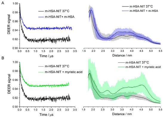 Q-band DEER results for dilution and myristic acid addition to m-HSA-NIT compared with sham controls incubated for 1 h at 37 °C. (A) control compared with 1:1 dilution with unlabeled m-HSA; (B) control compared with 25:1 excess of myristic acid. DEER time traces are shown on the left, distance distributions on the right. Shaded areas show uncertainty of distance distributions.