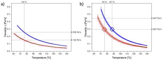 Temperature-dependent viscograms obtained at a shear rate of 100 s−1 for (a) PEG 3000 (red) and PEG 4000 (blue) and (b) PEG 3000 with 30 wt% CCX (red) and PEG 4000 with 30 wt% CCX (blue). Reference lines indicate the temperatures and viscosities used in this study. Mean ± SD (n = 3).