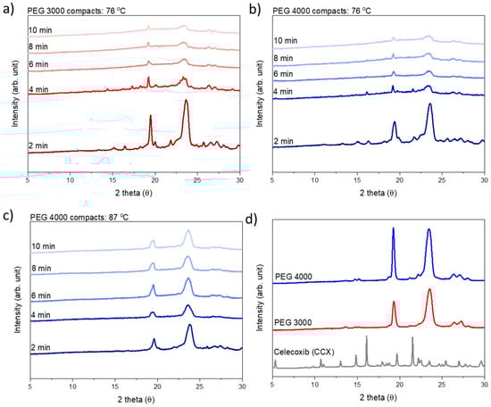 Following XRPD analysis, the compacts were categorized as amorphous either when a halo was obtained or the remaining diffraction peaks could be solely assigned to PEG, i.e., no crystalline CCX peaks were visible in the diffractograms (Figure 3). At a target temperature of 76 °C, PEG 3000 compacts required 6 min of exposure to microwave radiation to become fully amorphous, whilst PEG 4000 compacts required 10 min. As hypothesized, this can be explained by the viscosity of PEG 4000 compacts being higher as compared to PEG 3000, at all temperatures measured during microwave exposure (Figure 1 and Figure 2), and hence a faster rate of amorphization was obtained for CCX in the PEG 3000 compacts.