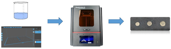A total of 50 g of each formulation was prepared by mixing with the magnetic stirrer for 12 h until complete dissolution, keeping the mixture protected from light. The mixture was then transferred into the resin tray and printing was initiated.