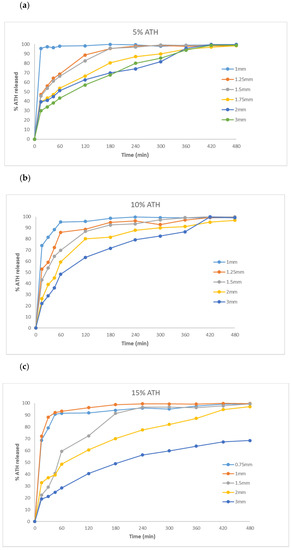 Drug dissolution profiles of the printed tablets were obtained by USPII Erweka DT 600 (Erweka, Langen, Germany) apparatus. Tablets were placed in 500 mL of distilled water for 8 h. The paddle speed was fixed at 50 rpm, and the testing was conducted at 37 ± 0.5 °C. Samples (5 mL) were withdrawn at 15, 30, 45, 60, 120, 180, 240, 300, 360, 420 and 480 min time intervals, filtered through 0.45 µm filters (Millipore, Bedford, MA, USA) and the amount of released ATH was determined UV spectrophotometrically at 270 nm (Evolution 300, Thermo Fisher Scientific, Waltham, MA, USA). According to Krkobabic et al., the type of apparatus (paddle apparatus or flow-through cell) and medium (distilled water or 0.1 M HCl) do not significantly affect the ATH dissolution rate from 3D-printed tablets [30].