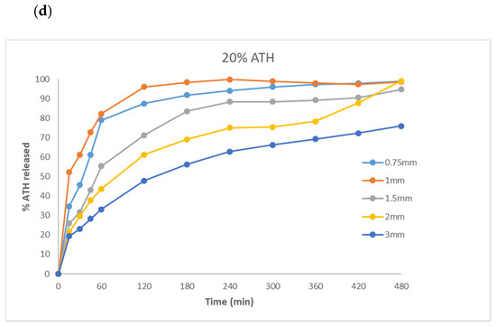 Other fabricated tablets expressed modified-release characteristics, with complete release of ATH except from 3-mm-thick tablets containing 15% and 20% of the drug, which released 68.42% and 72.29% of drug, respectively, within 8 h. This slower release rate can be attributed to the longer exposure time during printing which leads to a higher degree of incorporation of the drug within the polymeric matrix and stronger mechanical characteristics of these tablets, as previously shown. The results therefore suggest the influence of geometrical dimensions and mechanical characteristics on drug release profiles.
