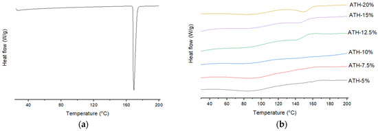 DSC (differential scanning calorimetry) thermograms of: (a) pure ATH prior to printing, and (b) the DLP 3D-printed tablets with different amounts of ATH.