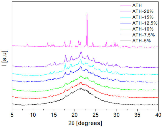 XRPD was used to study the physical form of the active substance in the fabricated tablets. The X-ray diffractogram of pure ATH exhibited multiple diffraction peaks at 17.6°, 18.2°, 18.9°, 21.3°, 23°, 24.3° and 27.5° 2θ, which reflect its crystalline form (Figure 6). Diffraction peaks characteristic for crystalline ATH can be distinguished for formulations containing over 12.5% of the drug. The broadening of ATH peaks in formulations containing below 12.5% of ATH indicates the reduction of drug crystallinity. However, a peak positioned at 17.6 θ is present on the diffractograms of formulations with 5%, 7.5% and 10% of ATH, while a peak at 21.3 θ can be additionally observed on diffractograms of formulations with 7.5% and 10% of ATH. These results indicate that the drug is present in a crystalline form in all prepared formulations, with a particular reduction in drug crystallinity in formulations containing less than 12.5% of ATH. This is also confirmed with the microscopic observations, which are discussed in the following section.
