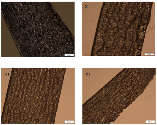 It was not possible to observe parallel layers in the printed tablets due to the presence of crystals of drug and the PI which covered them. On the other hand, on the photomicrographs of the cross section of the tablets after dissolution tests, layers are visible in some places, with the generation of cracks and channels which enabled the diffusion of the drug (Figure 8).