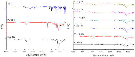 Fourier-transform infrared (FTIR) spectroscopic analysis was used for the assessment of compatibility between the drug and polymers used for the preparation of 3D-printed tablets. The FTIR spectra for PEGDA, PEG 400, ATH powder and fabricated tablets are presented in Figure 9.