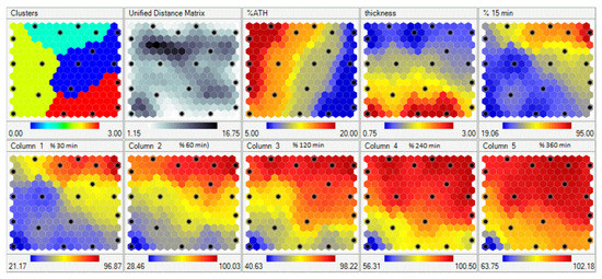 Data from 23 experiments were trained with the Kohonen learning rule in self-organizing maps (SOMs) with learning rate of 0.5. After training, SOMs are presented in Figure 10. Each input and output is presented as a separate region (map). The map consists of hexagonal cells, where each cell represents the SOM node. The node is associated with a data point to which it is closest.
