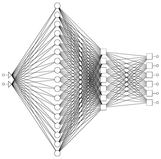 The next step in modeling was developing ANNs that could describe influence of tablet thickness and drug loading on ATH release from printed tablets. A total of 23 experimental runs were divided into training set (17), validation (4) and test set (2). A generalized regression neural network (GRNN) was trained (Figure 11). GRNNs have exactly four layers: input, a layer of radial centers, a layer of regression units, and output. The radial layer units represent the centers of clusters of known training data. This layer was trained by a K-means clustering algorithm, using smoothing factor 0.02. The maximal number of neurons in this layer is equal to number of training cases. During training, the number of units in the second layer was varied, and the lowest root mean square (RMS) for the training and validation data set was obtained with 17 units in the second layer. The third regression layer has one more unit then the output layer (7). The regression and output layer are trained extremely quickly using the specialized algorithm provided (called a division algorithm).