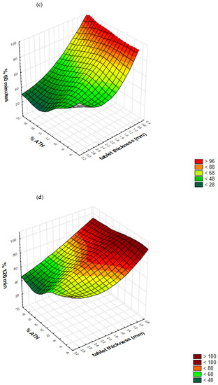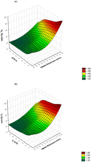 The results (Table 2) suggest that a higher content of ATH, as well as an increase in the tablet thickness, required a higher force to push the needle probe into the tablet, indicating their influence on the mechanical properties of the fabricated tablets. Taking into consideration that the hardness of the tablets may influence the drug release rate, the impact of those factors were further investigated in the in vitro dissolution testing.
