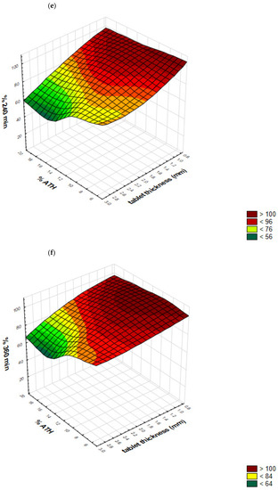 Response surfaces, representing outputs (Y1–Y6 percent of drug released after predetermined time intervals) as a function of drug loading (% ATH) and tablet thickness: (a) Y1—after 15 minutes; (b) Y2—after 30 minutes; (c) Y3—after 60 minutes; (d) Y4—after 120 minutes; (e) Y5—after 240 minutes; (f) Y6—after 360 minutes.