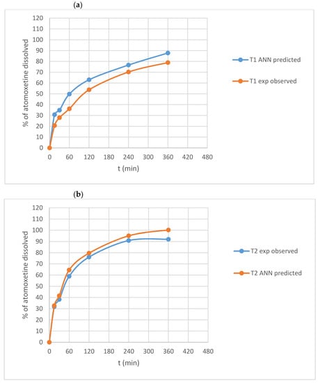 Additionally, for two test formulations, experimentally observed dissolution profiles versus profiles predicted using trained networks were evaluated using similarity factor f2. Dissolution profiles (experimentally observed vs. predicted) for T1 and T2 formulation are presented in Figure 13. Predicted dissolution profiles are similar to experimentally observed profiles, with calculated similarity factors of 51.05 and 70.13, respectively.